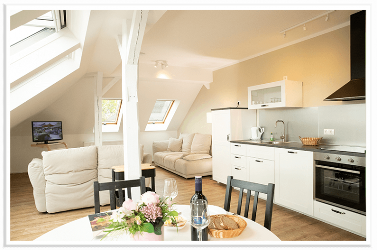 Über den Dächern von Güstrow bietet die neue Ferienwohnung im Hotel am Schlosspark mit zwei Doppelzimmern und einem Einzelzimmer auf 120m² Platz für 5 Personen (weitere Aufbettungen möglich). Die modernen Zimmer sind alle mit privater Dusche und WC ausgestattet und verfügen über TV und WLAN. Der kombinierte Wohn-/Essbereich hat große Panoramascheiben mit einem kleinen Balkon sowie zwei Sofas, eine offene Küche (Geschirrspüler, Froster, Herd/Offen) und eine Essecke. Haustiere sind erlaubt, rauchen jedoch strengstens untersagt. Auf Wunsch können selbstverständlich auch Frühstück oder Halbpension sowie weitere Zimmer hinzugebucht werden.